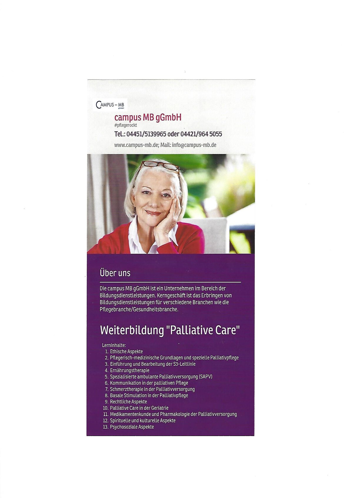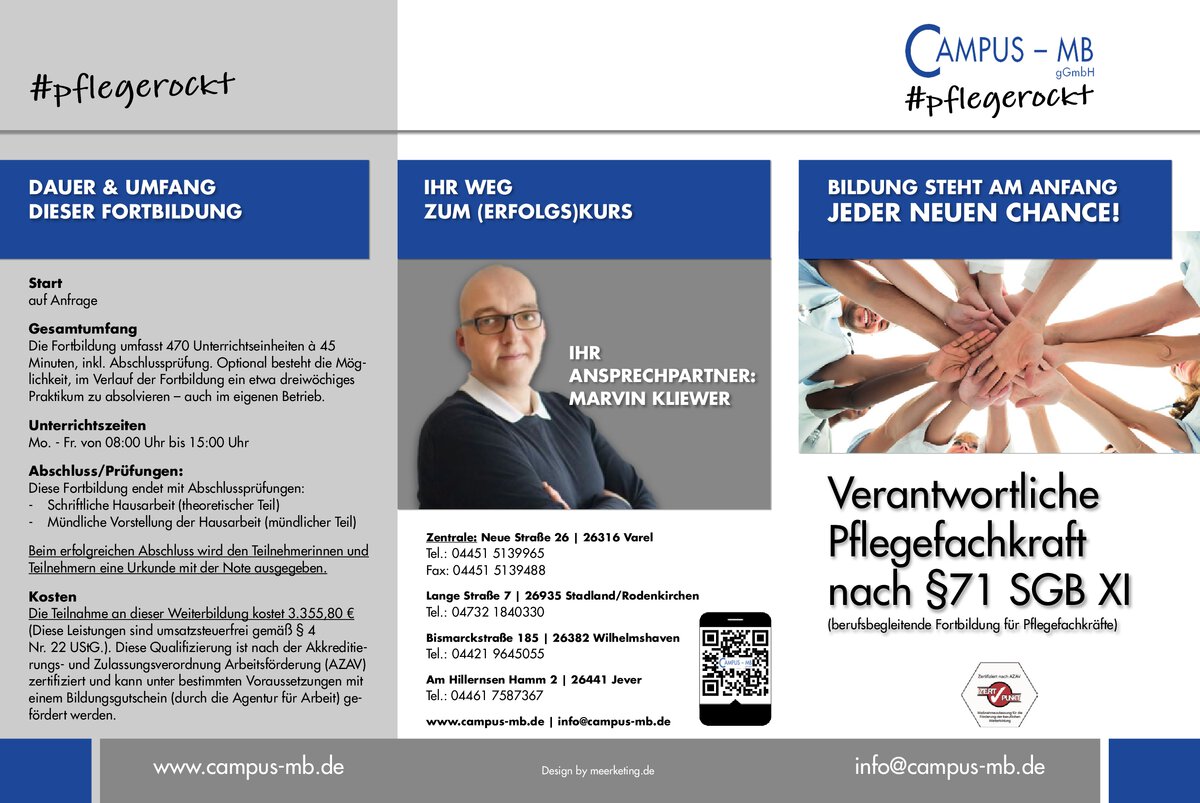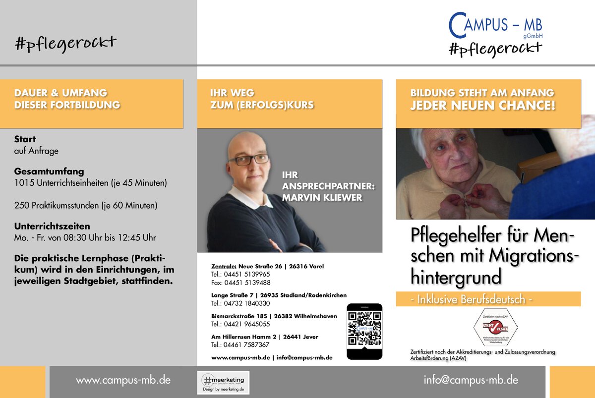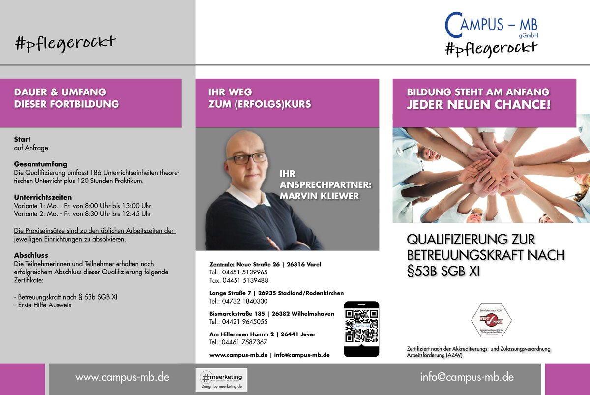 Die campus MB gGmbH ist ein anerkannter Träger für die Schulungen zum „niedrigschwelligen Betreuungsangebot nach §45 SGB XI“. Die Anerkennung ist ausgestellt vom Niedersächsischen Landesamt für Soziales, Jugend und Familie.